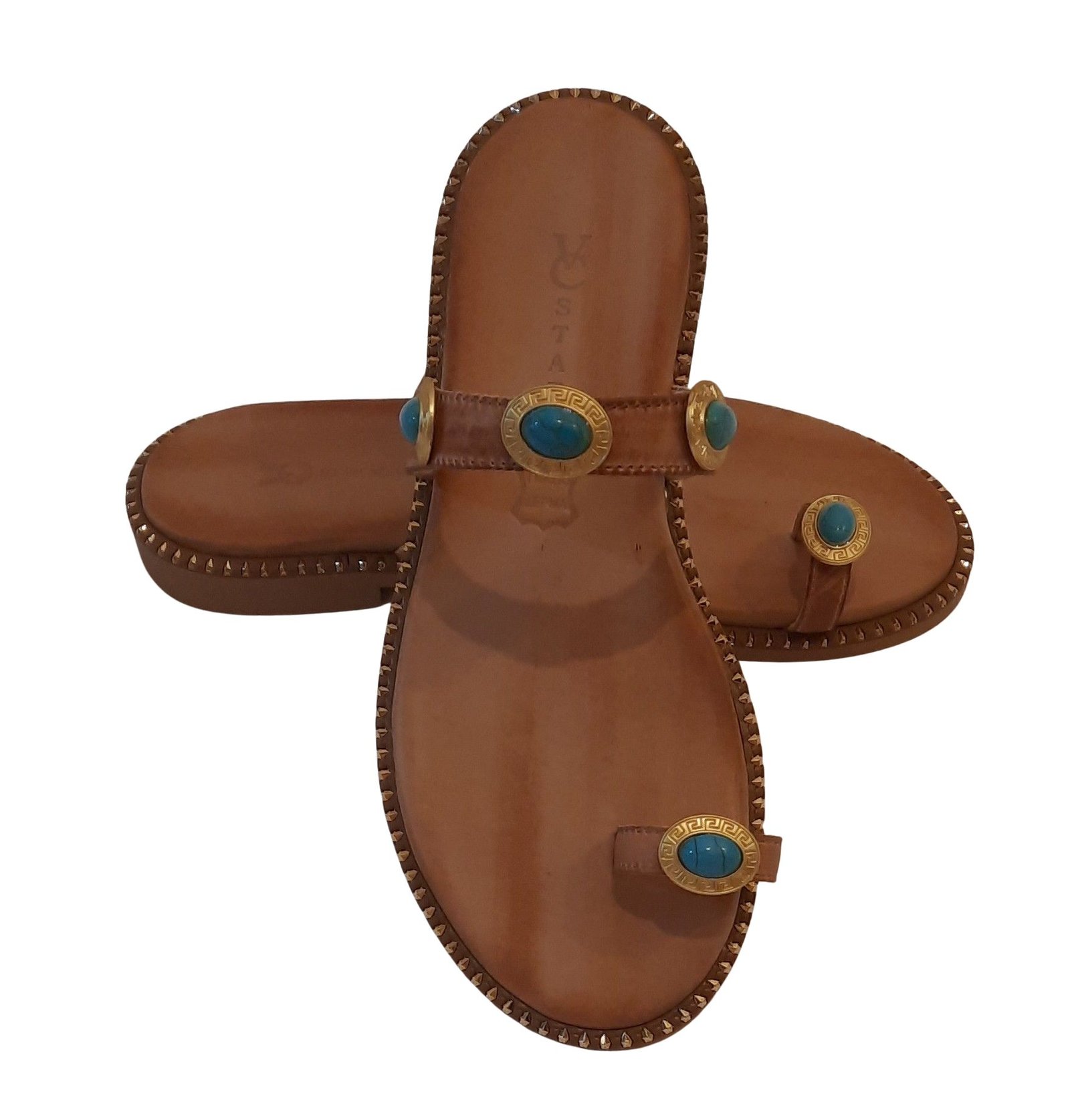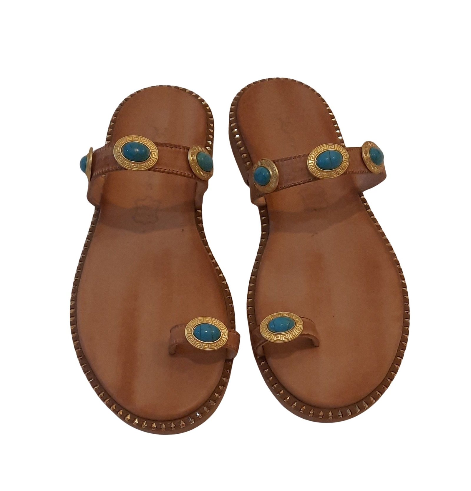 Χειροποίητα δερμάτινα σανδάλια σε καφέ χρώμα με λεπτομέρειες από τιρκουάζ πέτρες.